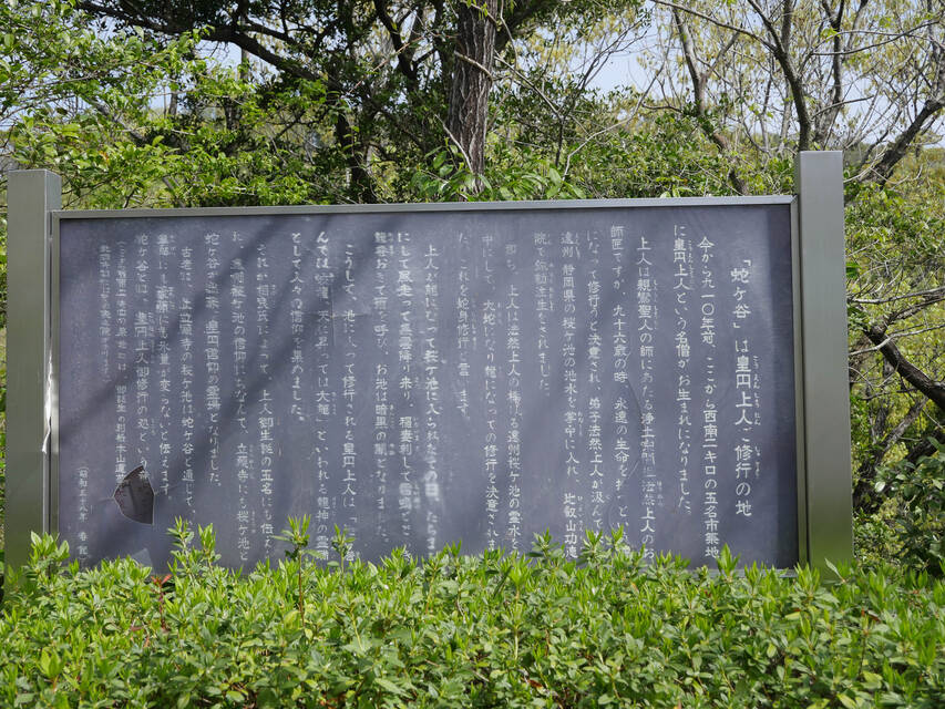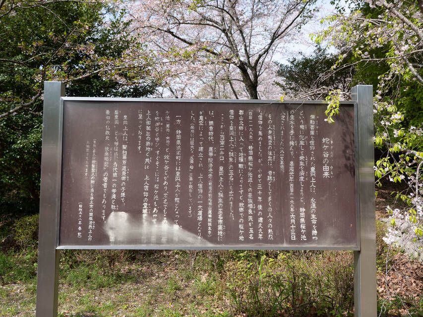 でもって、その皇円上⼈が亡くなるときに⿓に変⾝して衆⽣を救うために静岡県桜ヶ池に⿓⾝⼊定したわけだが、ここ皇円上⼈誕⽣の地に霊場として信仰の場が⽣まれたのがこの蛇ケ⾕公園ということになるようだ。この近くに蓮華院誕⽣寺という⼤きな寺院があるが、そこで祀られているのが皇円上⼈だということで、⾊々つながった。